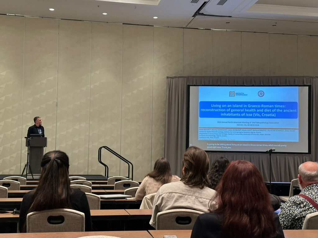Last week, collaborators on the ANCIENTROMANS project presented the results of their research at two scientific meetings taking place in Denver, USA. At the 53rd Annual North America Meeting of the Paleopathology Association, which took place from March 17th to 18th, Mario Novak, Mario Carić and Barbara Kriletić participated with a podium presentation entitled “Living on an island in Graeco-Roman times: Reconstruction of general health and diet of the ancient inhabitants of Issa (Vis, Croatia)”. At the 95th Annual Meeting of the American Association of Biological Anthropologists held from March 18th to 21st, Mario Novak and Hrvoje Vulić participated with a podium presentation „Human Remains in (Bio)archaeology: Ethical Dilemmas and Practices from a Croatian Perspective“, Anna J. Osterholtz, Mario Novak and Mario Carić participated with a poster presentation „Lead-Induced Metabolic Disease in non-adults from Roman-period Croatia: Paleopathological and Chemical Analyses from the Tragurium Communal Necropolis“, while Anna J. Osterholtz, Mario Novak and Mario Carić were co-authors of the poster presentation „Buried in a well: An osteobiographical study of two non-adult individuals from Roman period Mursa (Osijek, Croatia)“.